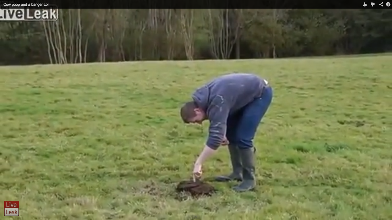 ネタ 2013年7月12日 牛のフンを爆竹で爆破するとこうなる 子供の頃だれもが遊んだことのある爆竹。 蟻の巣を爆竹で広げたり、果物を爆破させたり・・・ 男の子は一度は経験した事があると思います。 しかしこの青年達。 なんと牛のフンを爆破させるという強者。 牛のフンは腐敗するとメタンガスが発生するので、とんでもない爆発力になりそう・・・ 1,状態は分かりませんが、どこにでもある牛のフン。 2,これに爆竹を入れる為の穴を開ける。。。そう、指でねw 3,そしてライターで着火!!!!! 続きは動画をどうぞ!w 良い子は危険ですので真似しないでね(*´∀`*)