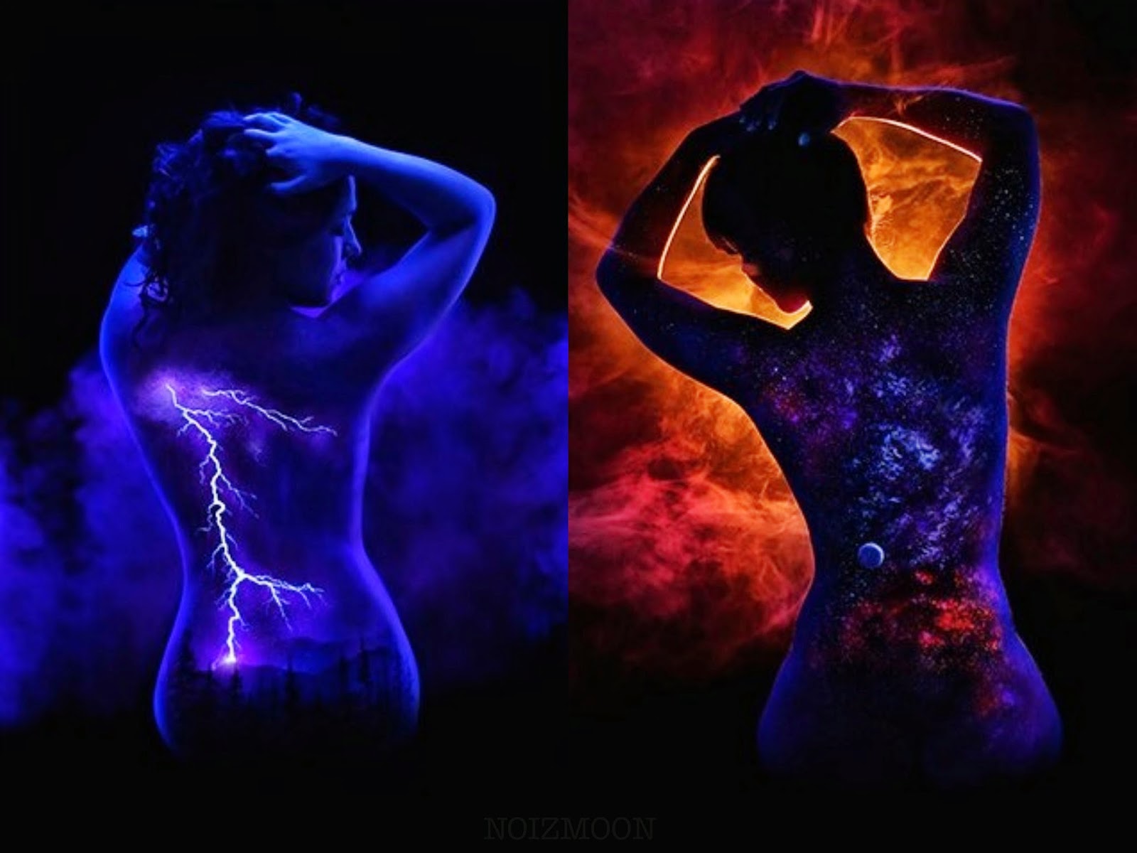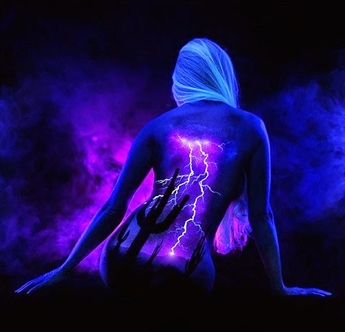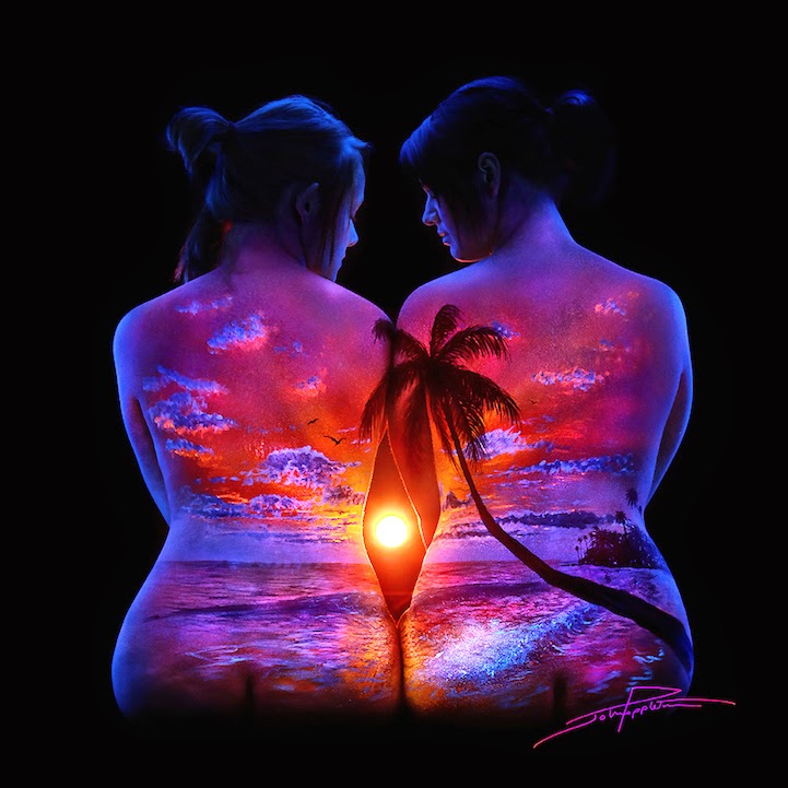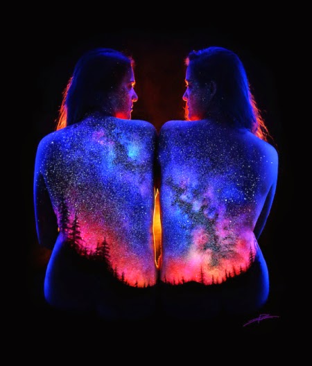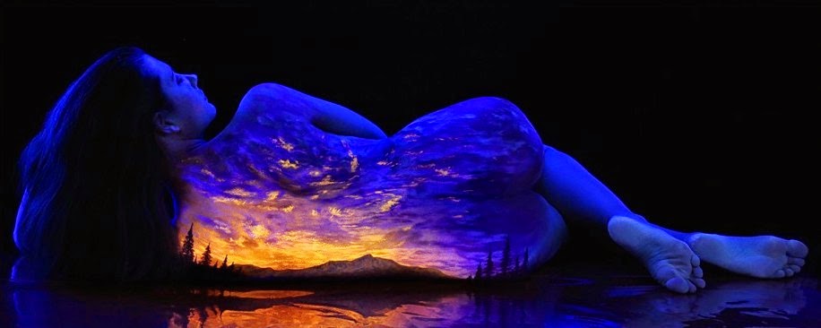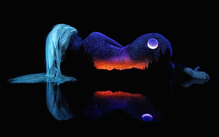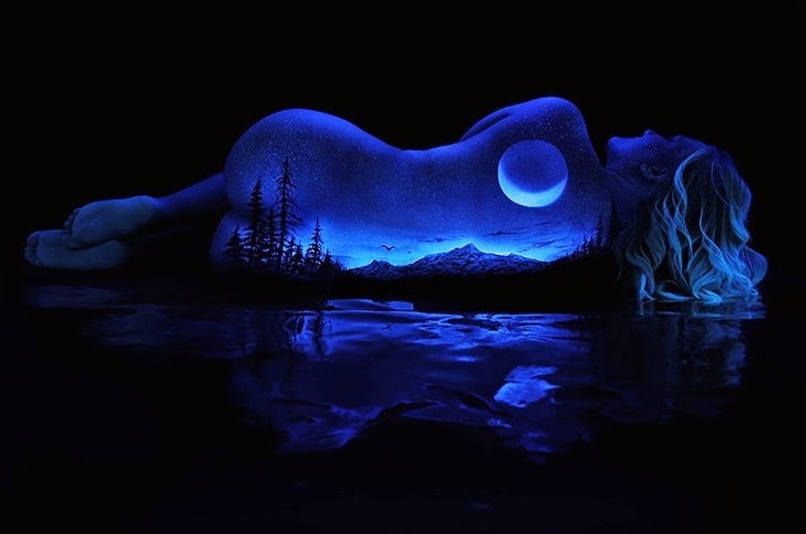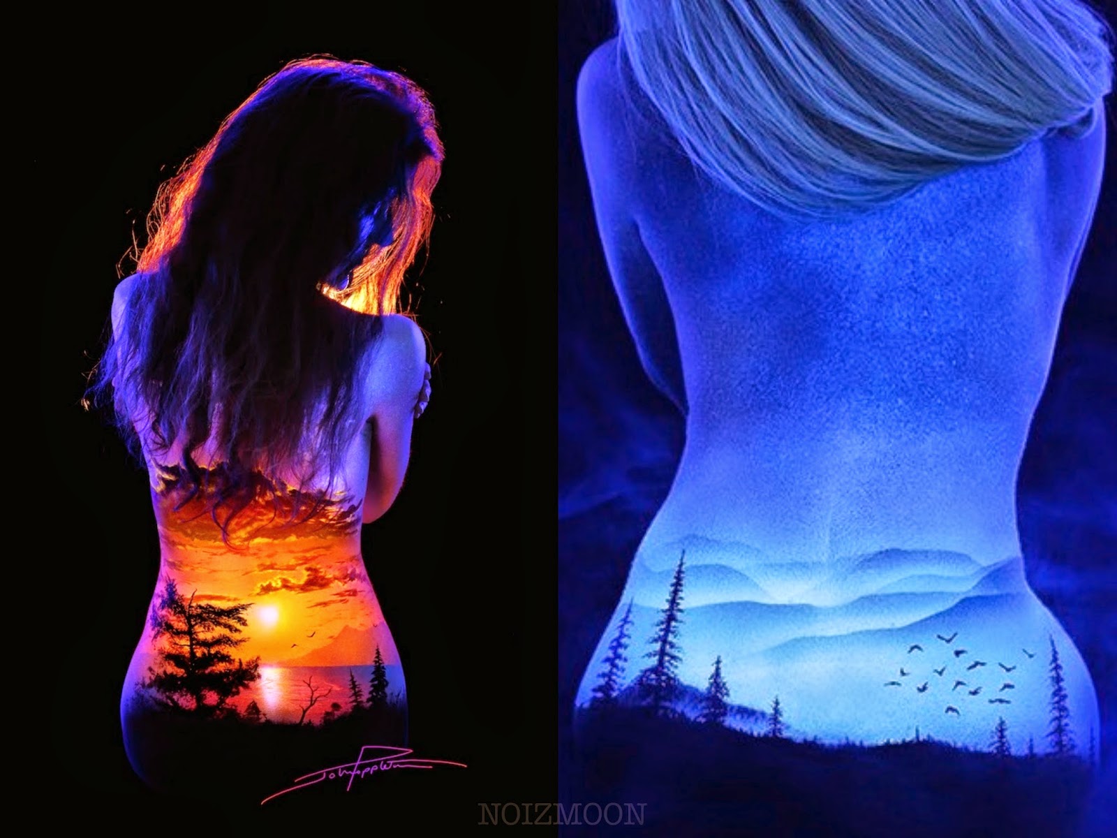 彼は、人間の体に蛍光塗料で幻想的な風景を描き、ブラックライト下で写真を撮影。