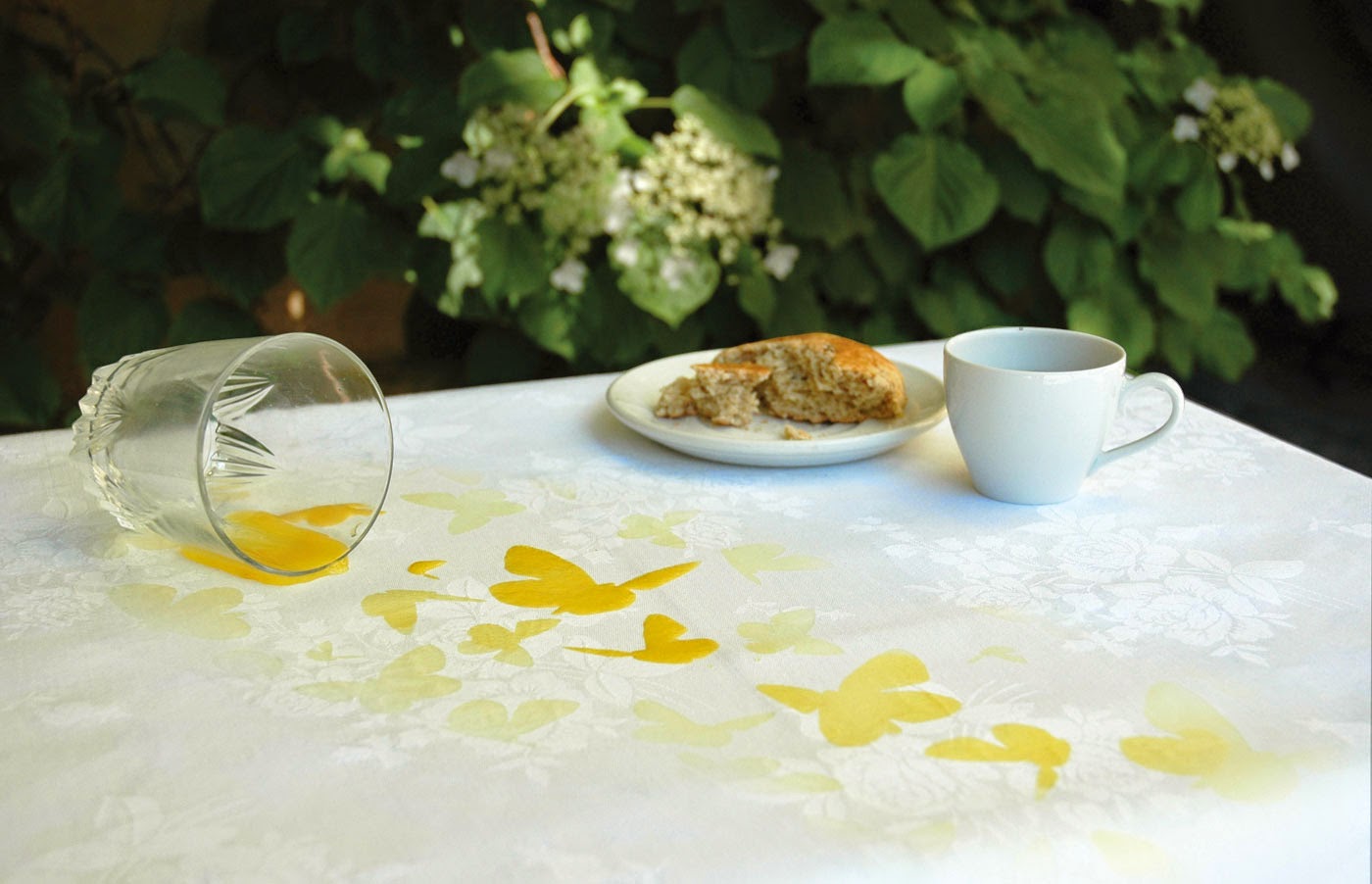 飲み物をこぼしてしまった時の不幸を、ハッピーに変えてしまうと云う魔法のテーブルクロスなんです!