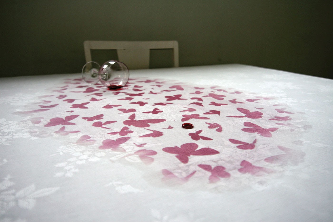 飲み物をこぼしてしまった時の不幸を、ハッピーに変えてしまうと云う魔法のテーブルクロスなんです!