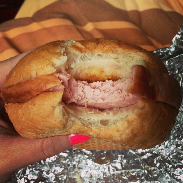 牛肉や豚肉、ベーコンを混ぜ焼いたものをサンドし熱いうちに食べる。