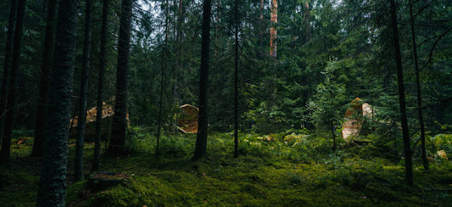 エストニア共和国タリン近くの森の中には、巨大な木製メガホンが3つ展示されています。